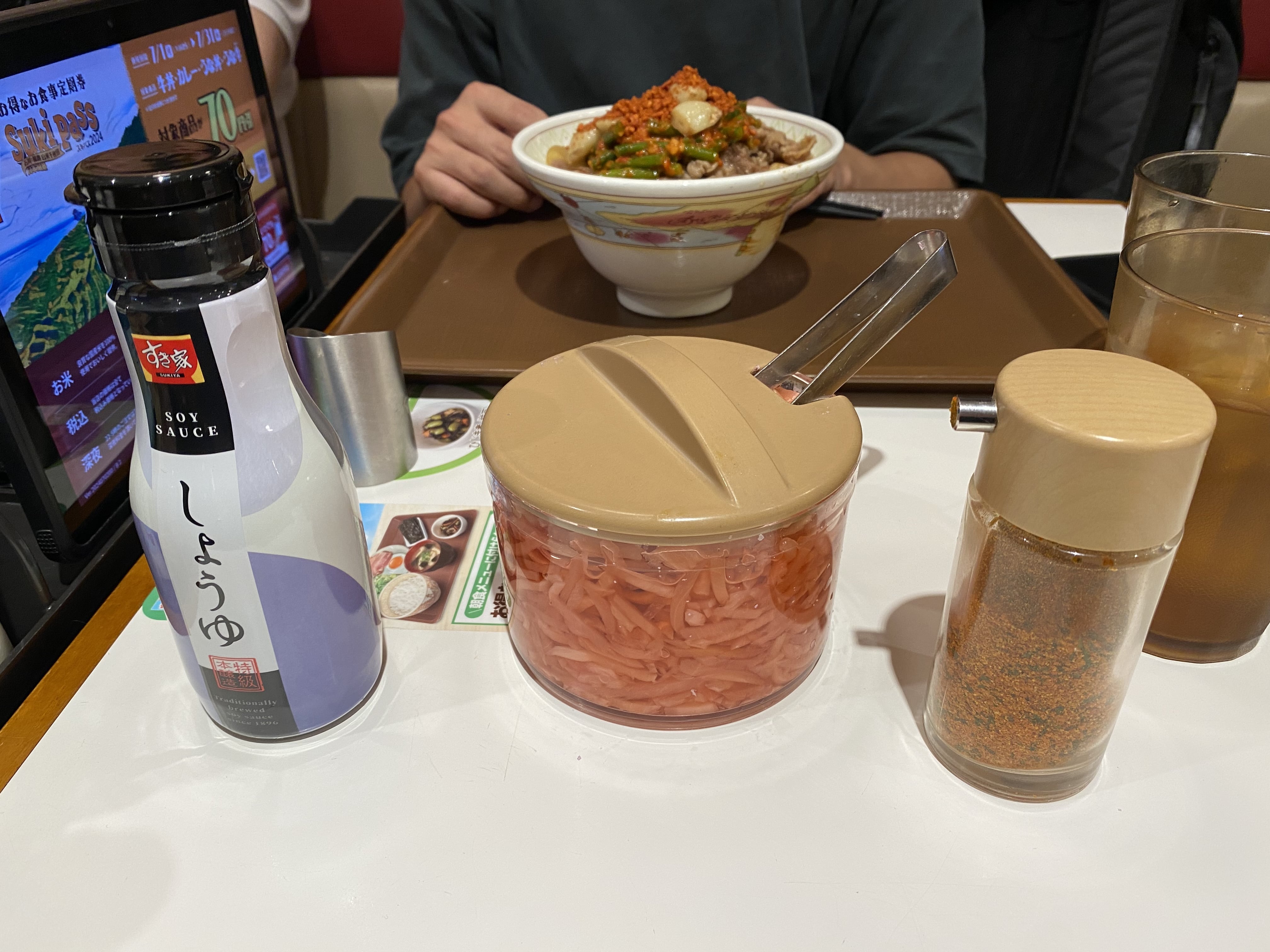 There are several condiments available. In the photo, from left to right, you see soy sauce, pickled ginger, and shichimi togarashi (seven-spice chili powder). Soy sauce is great for seafood bowls, while pickled ginger and shichimi togarashi are ideal for beef bowls.